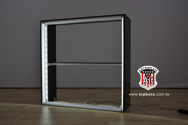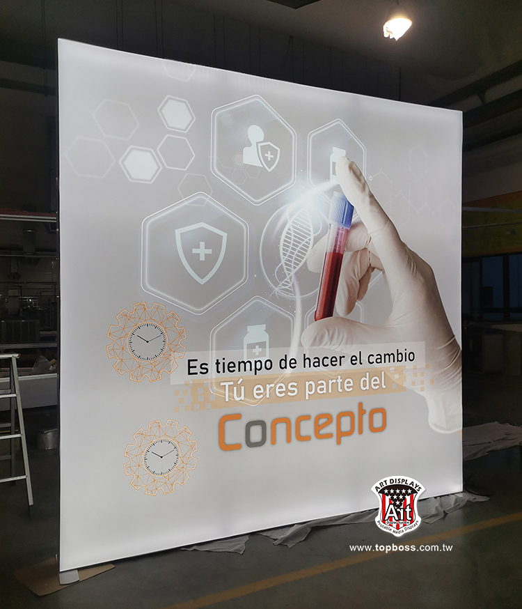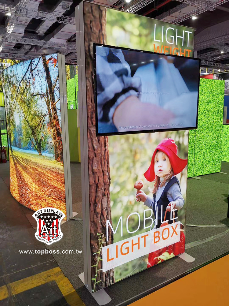 產品設計為携帶組合式燈箱,收納運送尺寸符合一般轎車即可運送,前置畫面為背打光無接縫阻燃燈布,後置為黑白遮光布易於攜帶,畫面摺疊展開後平整無摺痕,LED打光後讓您的廣告畫面光彩奪目~