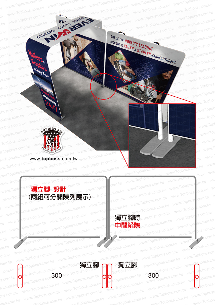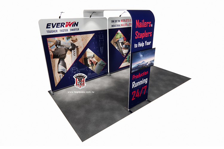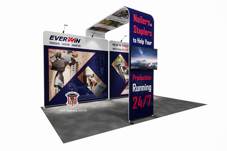 輕量且完全客製化的結構設計,高科技阻燃布,數位微噴設備(韓國D.gen)寬300公分無接縫,全國最大輸出尺寸,重複使用能取代木工裝潢的時間,節省拆除後的資源浪費,更能取代傳統制式鋁架拼接組合呆板的樣式!