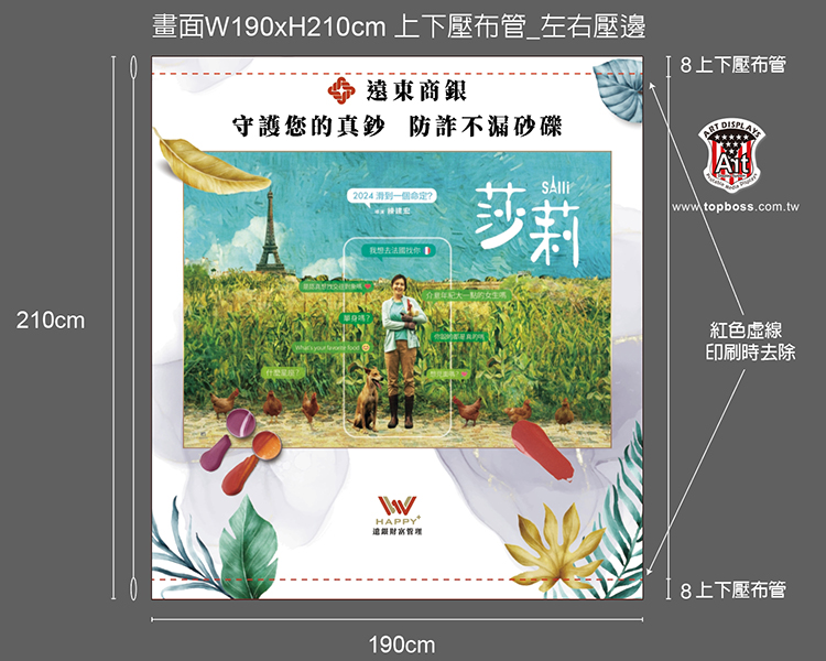 畫面尺寸: 319x215cm 左右縫1cm單線,上下縫平鋪10cm 旗套,