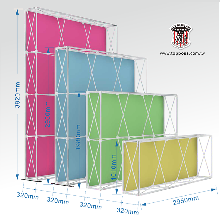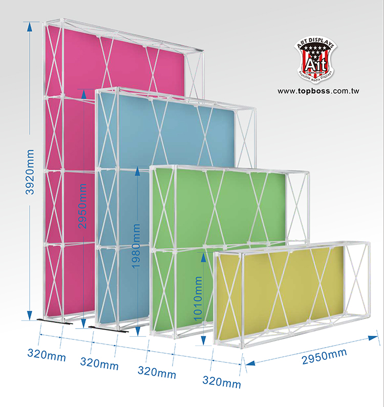 最新技術的拉網式卡布展屏 ,輕便的讓您難以置信集束成捆的網架 ,幾分鐘內彈起成一個大框架 ,既靈活又整潔,300cm高寬無接縫輸出 ,配合專用投射燈 ,令您的展品陳列光彩奪目 ,安裝簡易、無須任何工具;架身輕巧、易於攜帶;亦可自由組合及重覆使用,(若需現場安裝費用另計)。