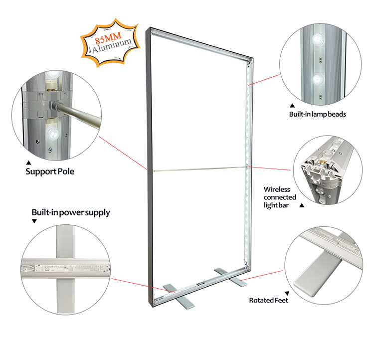 4、 拉布燈箱採用優良鋁合金材質,規格有 4/ 6/ 8/ 10/ 12cm厚度,單面燈箱或者雙面燈箱設計,用角碼進行拼接,組裝上非常簡單快速。
