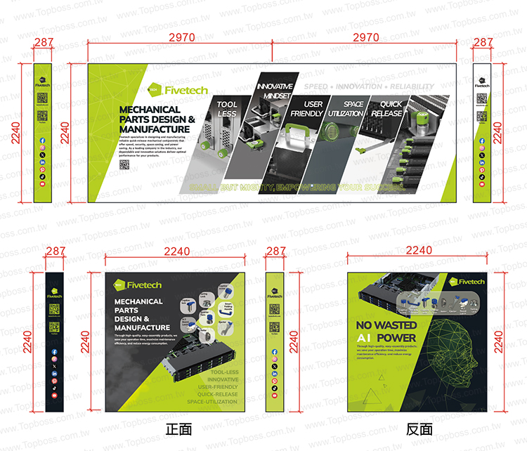 最新技術的拉網式卡布展屏 ,輕便的讓您難以置信集束成捆的網架 ,幾分鐘內彈起成一個大框架 ,既靈活又整潔,300cm高寬無接縫輸出 ,配合專用投射燈 ,令您的展品陳列光彩奪目 ,安裝簡易、無須任何工具;架身輕巧、易於攜帶;亦可自由組合及重覆使用,(若需現場安裝費用另計)。