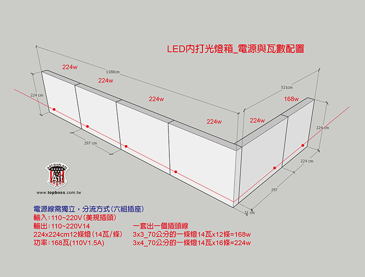 可選擇有: (一) 內打燈(LED燈箱) (二) 外打燈 頂燈方式