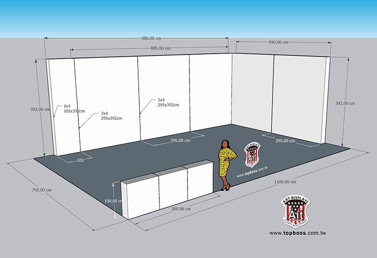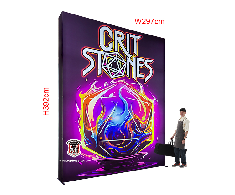 最新技術的拉網式卡布展屏 ,輕便的讓您難以置信集束成捆的網架 ,幾分鐘內彈起成一個大框架 ,既靈活又整潔,300cm高寬無接縫輸出 ,配合專用投射燈 ,令您的展品陳列光彩奪目 ,安裝簡易、無須任何工具;架身輕巧、易於攜帶;亦可自由組合及重覆使用,(若需現場安裝費用另計)。