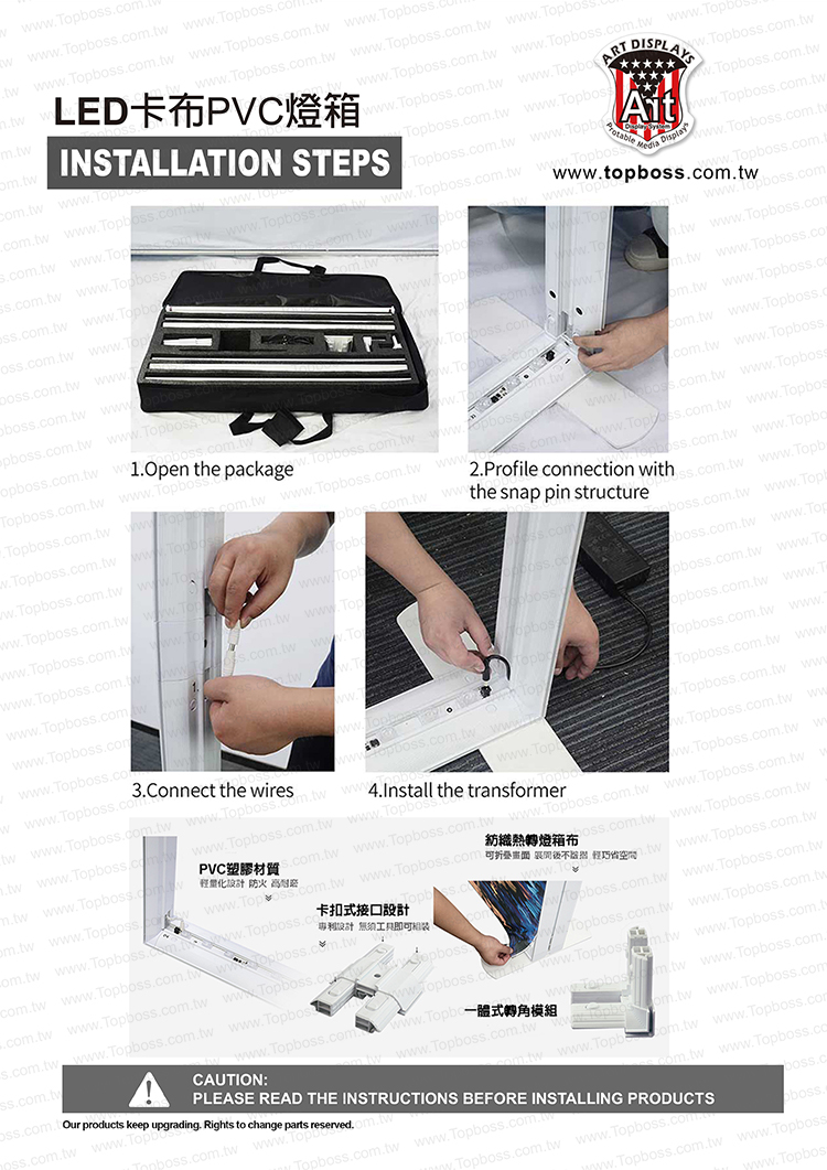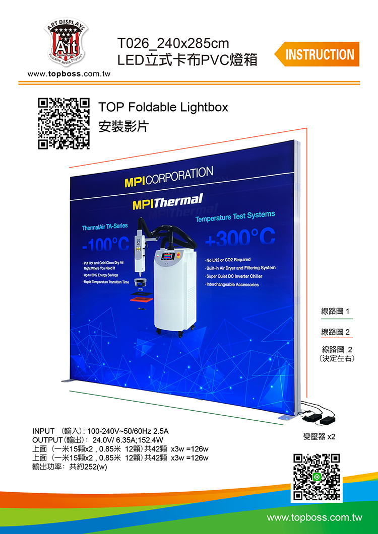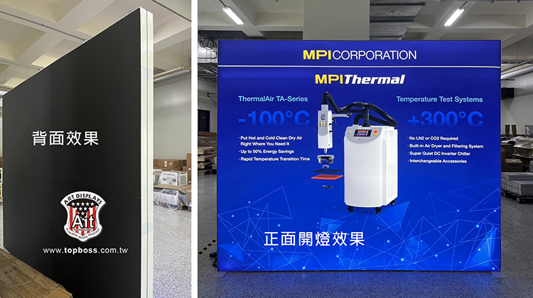 產品設計為携帶組合式燈箱,收納運送尺寸符合一般轎車即可運送,前置畫面為背打光無接縫阻燃燈布,後置為黑白遮光布易於攜帶,畫面摺疊展開後平整無摺痕,LED打光後讓您的廣告畫面光彩奪目~