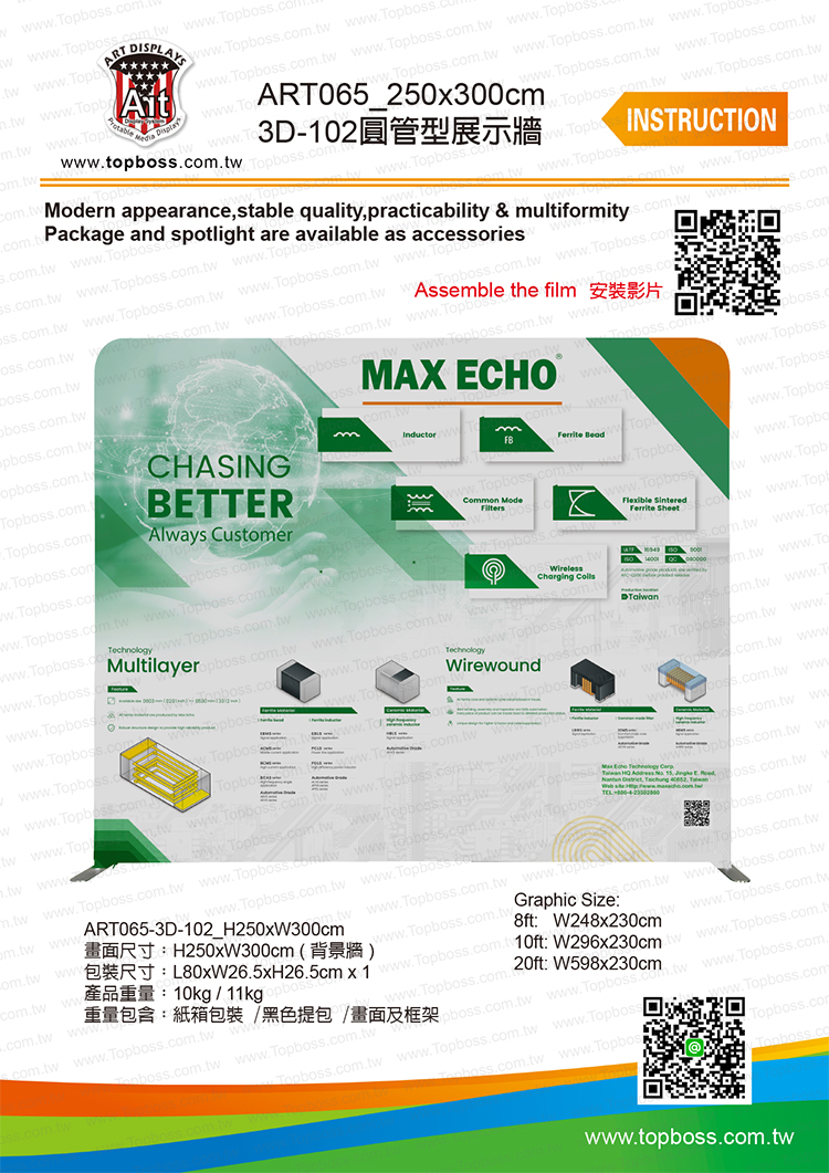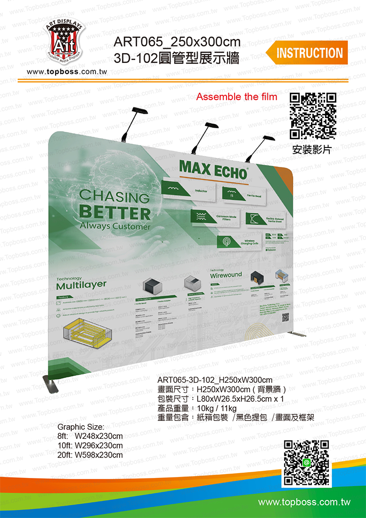 兩個人30分鐘即可輕鬆搭建完成,取代木工耗時搭建及呆版傳統的制式攤位,取代帆布搭起後的縐褶與反光效果,非常適展覽會場、記者會背景牆、大型活動背景牆、任何室內活動場地背景、百貨商場和飯店廣告牆、品牌行銷、產品廣告..........等,無加工時最寬320cm無接縫,長度可達1200cm (12米)以上。