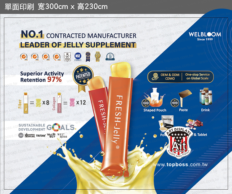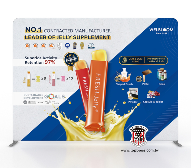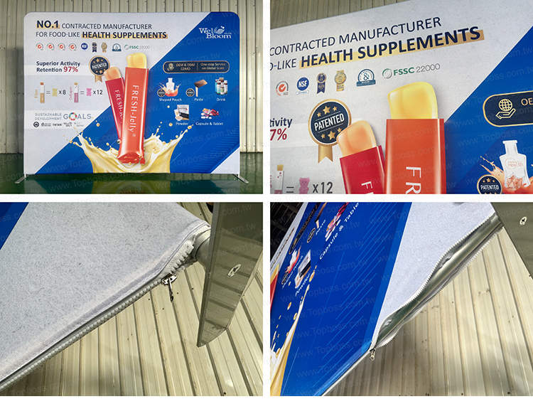 輕量且完全客製化的結構設計,高科技阻燃布,數位微噴設備(韓國D.gen)寬300公分無接縫,全國最大輸出尺寸,重複使用能取代木工裝潢的時間,節省拆除後的資源浪費,更能取代傳統制式鋁架拼接組合呆板的樣式