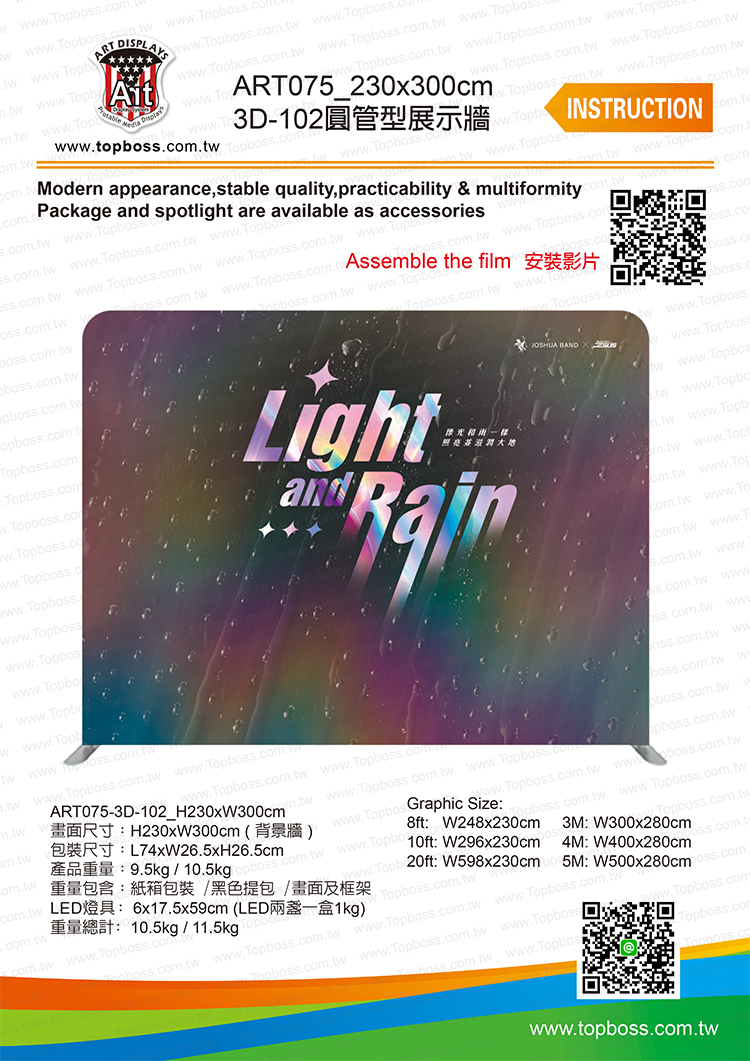 兩個人30分鐘即可輕鬆搭建完成,取代木工耗時搭建及呆版傳統的制式攤位,取代帆布搭起後的縐褶與反光效果,非常適展覽會場、記者會背景牆、大型活動背景牆、任何室內活動場地背景、百貨商場和飯店廣告牆、品牌行銷、產品廣告..........等,無加工時最寬320cm無接縫,長度可達1200cm (12米)以上。