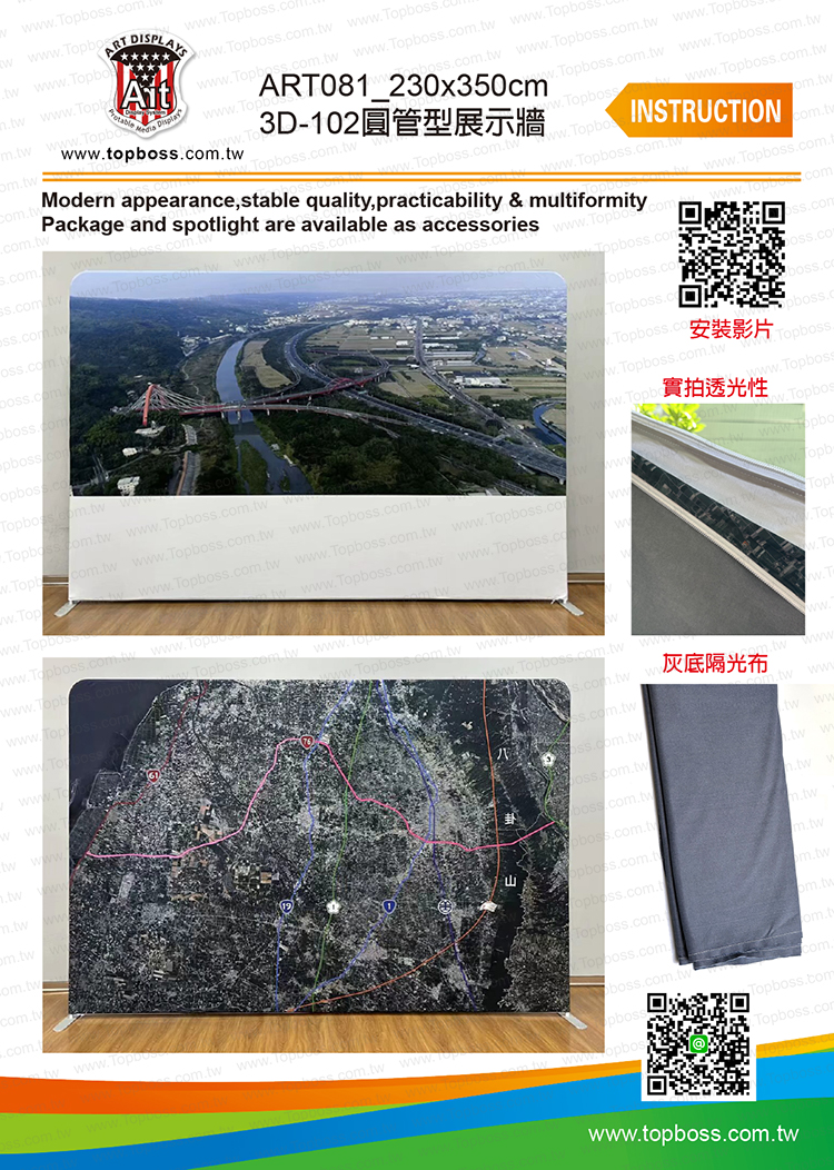 輕量且完全客製化的結構設計,高科技阻燃布,數位微噴設備(韓國D.gen)寬300公分無接縫,全國最大輸出尺寸,重複使用能取代木工裝潢的時間,節省拆除後的資源浪費,更能取代傳統制式鋁架拼接組合呆板的樣式!