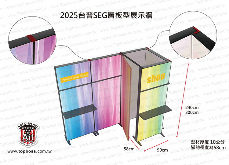 台普陳列型卡布燈箱 產品尺寸 60x240cm 90x240cm 120x240cm 可多組拼接當展示牆(層板/掛勾) 高度可客製200/240/300/360cm 層板掛勾任意位置 層板深度30cm